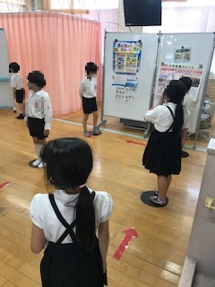 混雑しないよう、呼ばれた学級から順に教室から保健室へ来て、1.5m程度の間隔を空けて並んで待ちます。保健室内でも同様です。