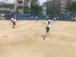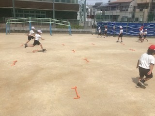 ミニハードル(高さが10cmないくらい)をおいて、ハードル走につなげる運動を行いました。高さのないハードルですが、子どもたちは意識して「跳んで」超えようとしますが、まずはハードル間を一定の歩数やリズムで「駆け抜ける」ことができるようになってほしいと思います。