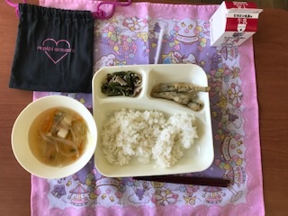 6月9日の給食は「ごはん・牛乳・いわしてんぷら・五目汁・豚肉とさんどまめのいためもの」でした。