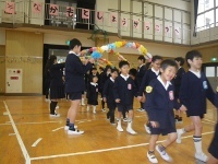 四年生からメダルを、二年生から六年生で「一年生になったら」の歌を一年生にプレゼントしました。