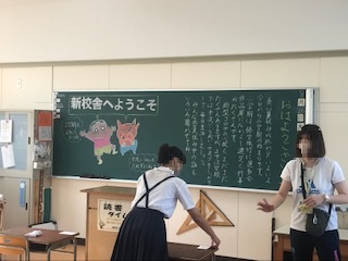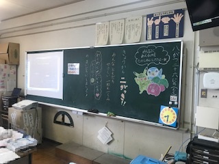 教室に入ると、黒板には担任の先生からのお迎えの言葉がありました。先生たちも子どもたちに会えるのを楽しみにしていました!!
