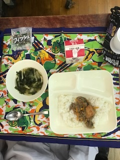 26日の給食は「マーボーあつあげ丼・中華スープ・ミニフィッシュ」でした。