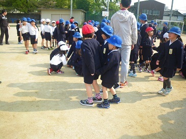 今日の児童集会では、みんなで「猛獣狩りに行こうよ」という遊びをしました。