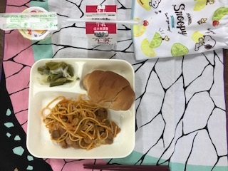 9月2日の給食は「こくとうパン(小)・牛乳・イタリアンスパゲッティ・グリーンアスパラガスとキャベツのサラダ・みかんゼリー」でした。