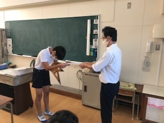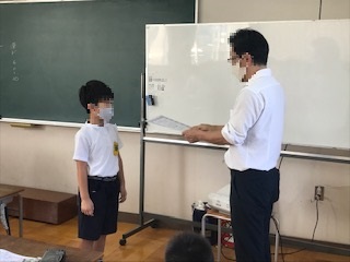 また、この日は図工の作品への賞状が届いており、朝会で校長先生から紹介され、その後、教室で表彰を行いました。