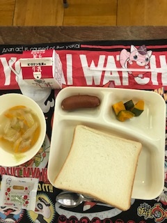 9月7日の給食は「食パン・牛乳・フランクフルトのケチャップソース・スープ・焼きかぼちゃ・リンゴジャム」でした。