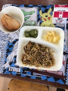 9月10日の給食は「こくとうパン・牛乳・焼きそば・きゅうりのしょうがづけ・パインアップル(カット缶)」でした。