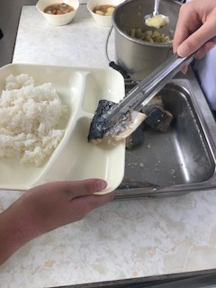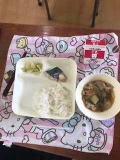 9月16日の給食は「ごはん・牛乳・さごしの塩焼き・豚肉とじゃがいもの煮もの・キャベツの梅風味」でした。
