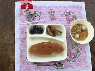 9月28日の給食は「おさつパン・牛乳・あげぎょうざ・中華煮・ぶどう(巨峰)」でした。