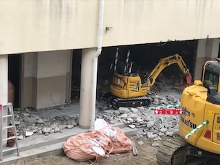 9月29日時点で、解体準備に入っている旧北校舎の各教室内の壁や床等が取り壊されています。たくさんの瓦礫が出てきています。