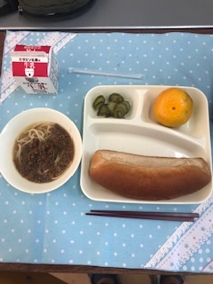 12日の給食は「こくとうパン・牛乳・タンタンめん・きゅうりの甘酢づけ・みかん」でした。