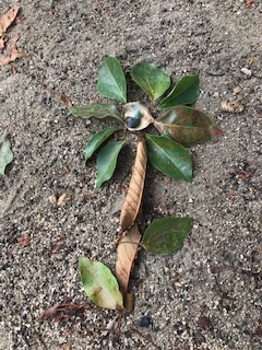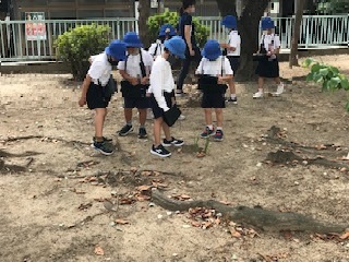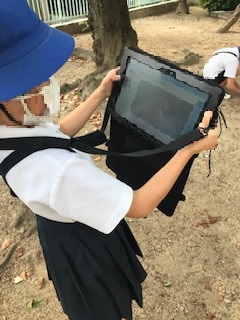 落ち葉や木の実など、秋を探し、それをうまく組み合わせて作品を作っていました。完成した作品は端末で「カシャッ」と撮影。面白い作品ができていました。