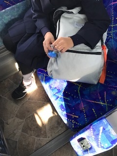子どもたちには本校に生活指導支援員として週2回勤務していただいている先生から、手作りの名札をいただきました。2号車ではトイレ休憩後に、リュックサックに付けていました。