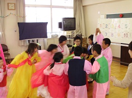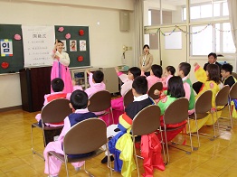 韓国・朝鮮にルーツを持つ子どもたちが「集い」「出会い」、ウリマル(韓国・朝鮮語)・歴史・文化などを学ぶ場です。この場を通して子どもたちは、仲間たちとともに自分のルーツ・民族について知り、民族につながる「自分自身」のことを大切にする気持ちを育みます。また民族学級はクラスの連携・民族講師との交流等を通して、学校全体への多民族・多文化共生教育を発信する場となっています