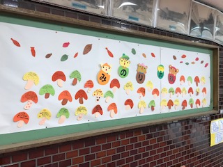 10月は2年生が担当。実りの秋をテーマに、かわいいきのこがたくさん並んでいました。子どもたち一人一人にとっての実りが書かれていました。