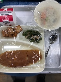 21日の給食は「おさつパン・牛乳・白菜のクリーム煮・あつあげのごまじょうゆかけ・豚肉とさんどまめのオイスターソースいため」でした。