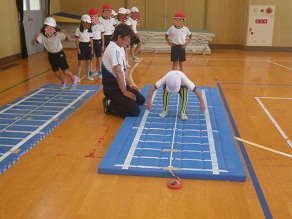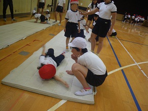 昨日の雨で、運動場が使えませんでした。今日は室内でする体力テストを行いました。特に今日は1・6年生、2・5年生、3・4年生が交流しながら、体力テストを行しました。1年生は初めての体力テストなので、6年生がやり方を教えてあげたり、次の測定のお手伝いをしていました。その優しい接し方は、「さすが6年生」という接し方でした。