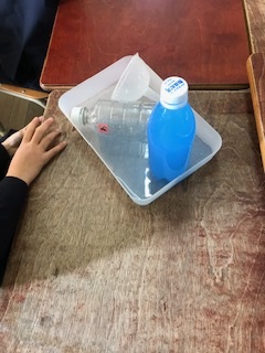 水のかさを比べるにはどうしたらよいか、実際に水を移し替えてみて考えます。