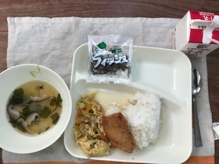 この日の給食は「ごはん・牛乳・カツ丼・すまし汁・ミニフィッシュ」でした。
