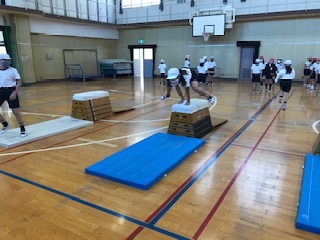 この日、3年生が跳び箱運動にチャレンジ。練習を重ね、ずいぶんと上手になってきました。開脚とびのポイント、「両足踏切」「両手を遠くにつく」を意識してがんばっています。
