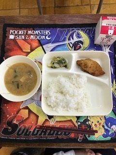 10日の給食は「ごはん・牛乳・たらフライ・さつまいものみそ汁・きくなとはくさいのごまあえ」でした。