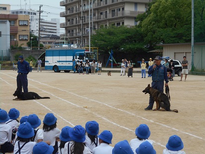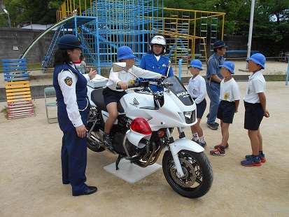 子どもたちは警察の方からの話を真剣に聞き、防犯について多くを学ぶことができました。また、普段滅多に見られない、パトカーや白バイ、レスキュー車、青パトにふれ、さらに警察犬にもふれ、とてもいい経験となりました。