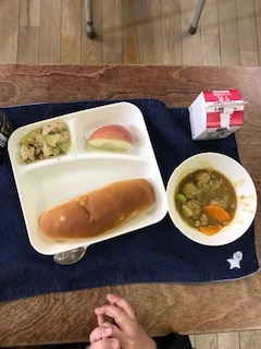 14日の給食は「おさつパン・牛乳・ミートボールと野菜のカレー煮・ツナとキャベツのソテー・りんご」でした。
