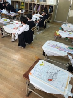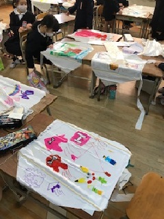 土曜授業のこの日、1年生は凧揚げのための凧制作に取り組みました。それぞれの凧に思い思い絵を描いたり、言葉を書いたりしました。