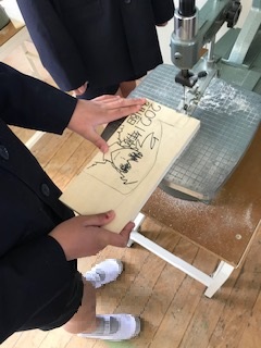 この日、図工室では電動糸のこぎりを使って、デザインした形に切り取る作業をしていました。
