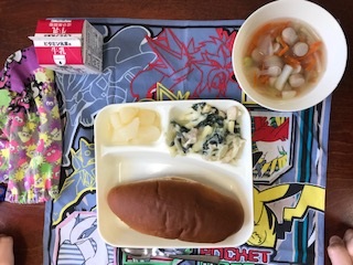 1月27日の給食は「こくとうパン・牛乳・マカロニグラタン・ウインナーのスープ・和なし(カット缶)」でした。