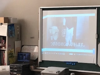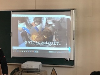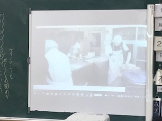 この日の給食の時間、各クラスでは、給食調理中の様子等を撮影した動画を見ました。