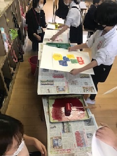 切り貼りした版を何色かのインクをのせておさえて写します。