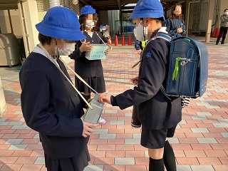 朝の登校時に東側通用門で計画委員が募金箱を持って立っていました。