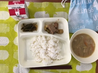 15日の給食は「ごはん・牛乳・まぐろの甘辛焼き・豚汁・くきわかめのつくだ煮」でした。