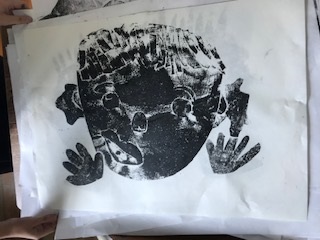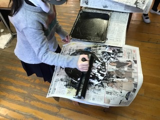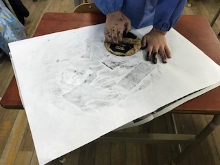 1年生の紙版画は切り貼りが終わり、版が完成し、いよいよ刷る作業へ!
