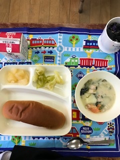16日の給食は「こくとうパン・牛乳・ほうれん草のクリームシチュー・キャベツのサラダ・洋なし(カット缶)」でした。