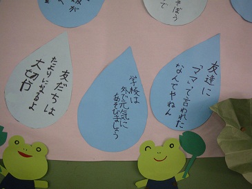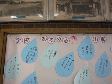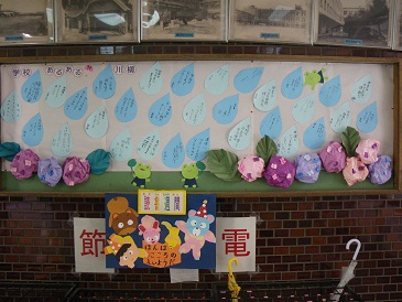 正面玄関入って右手には、大きな掲示板があります。毎月担当する学年が決まっており、今月は5年生が担当しています。5年生が担当した掲示は「学校あるある川柳」です。6月は梅雨です。雨の水滴一粒一粒に、子どもたちの学校あるある川柳が書かれています。心温まる川柳やくすっと笑える川柳があります。来校の際には、ぜひ目を向けてみてください。
