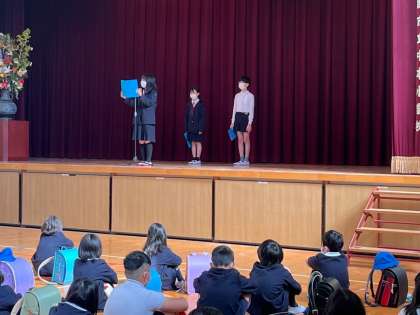 4月8日の始業式では、6年生の代表の児童が今年の目標を発表しました。さすが最高学年、2年生から6年生の前で、堂々と発表していました。