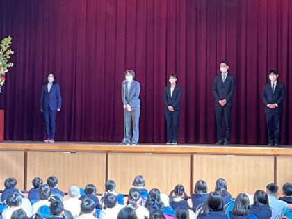 また、始業式に先立って、今年中本小学校に新しく赴任した教職員を迎える着任式が行われました。5人の新しい先生方の自己紹介に、子ども達は興味津々に聞いていました。
