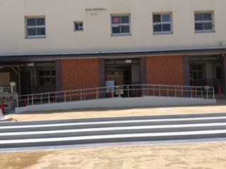 令和元年度から始まった新校舎建設に伴う各種工事がようやく完了しました。昨年の2学期に新北校舎が完成、引っ越しした後、旧北校舎の撤去、運動場の整地と工事が続いていましたが、4月28日ですべて完成です。玄関から運動場へはスロープも設置されました。