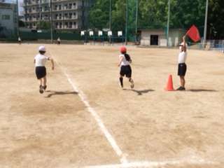 3年生が50メートル走の測定をしています。
