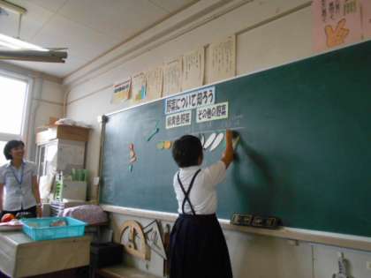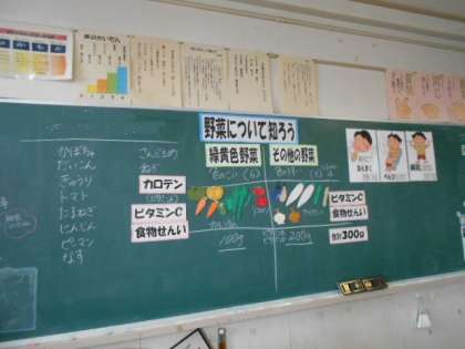 5年生は野菜について知る授業でした。野菜は「緑黄色野菜」と「その他の野菜」に分けられます。野菜は体調を整えてくれる、とても大切な食べ物です。5年生の子どもたちには、この授業を受けて、少しでも多く野菜を食べて、暑い夏を乗り越えてほしいです。