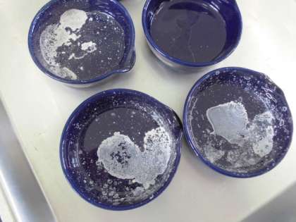 水溶液の性質の学習で、見た目やにおいで水溶液を区別したり、加熱することによって溶けているものを取り出したりします。今回は、加熱によって食塩や重曹を取り出していました。