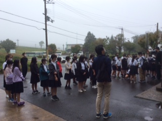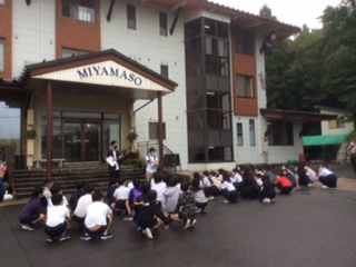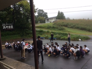 雨が上がったので、玄関前に集合。午後の予定の登山は明日に延期となり、この後はキーホルダー作りになりました。