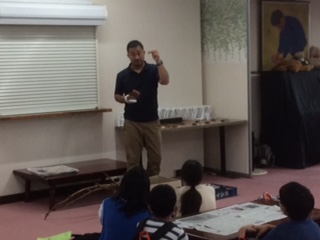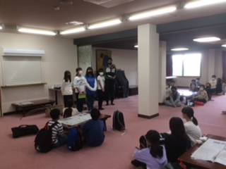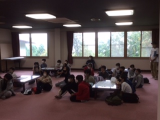 宿舎の方に、キーホルダー作りの説明をしていただきました。のこぎりやきりを使うので、安全に関する注意もしっかり聞きます。
