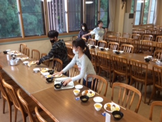 朝ご飯は食堂で食べますが、みんなが集まる前に、食事係が各活動班の準備をしています。