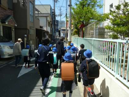 今日は学校はお昼前で終わり、1年生は同じ方向に帰る児童でまとまって教職員が付き添い、下校しました。
