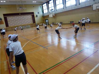 まずは、体の柔らかさ及び巧みな動きを高めるため、力強い動き及び動きを持続する能力を高めるための運動にペアで取り組んでいました。
