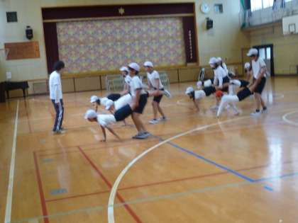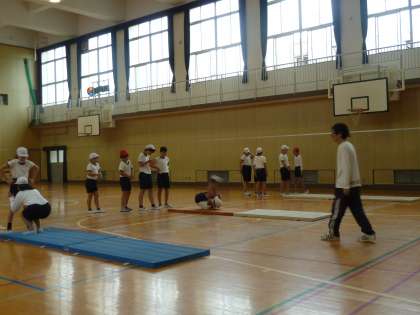 途中、先生から「後転」で手を突き伸ばすタイミングについてアドバイスがあり、スムーズにできる児童が増えていました。