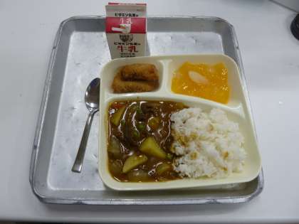 入学お祝い献立(カツカレーライス、フルーツゼリー、牛乳)